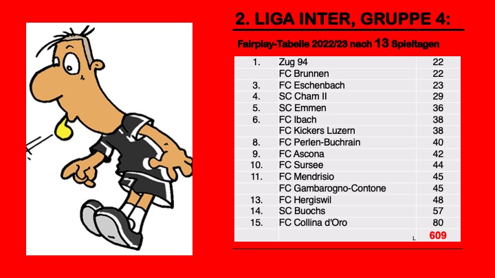 Bis und mit dem 13. Spieltag wurden in den bislang 184 Partien in der 2. Liga inter, Gruppe 4 insgesamt 609 Strafpunkte ausgesprochen. Dies ergibt einen Durchschnitt von 3.3 Strafpunkten pro Spiel!