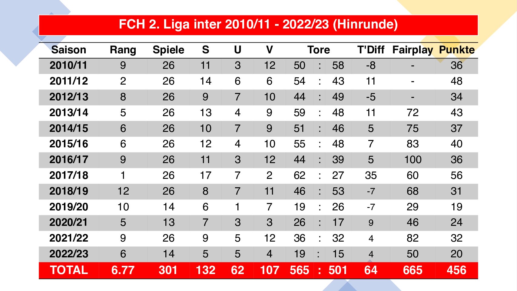 Kommentar Hinrunde 2022/23 – FCH 1-Teamfoto & Kader – Best Players” – Hinrunde 2022/23 in Zahlen – Heim- & Auswärts-Tabelle – FCH-Resultate Hinrunde – Auf- & Abstiegsplätze 2. Liga inter – FCH-Torschützen 2022/23 – FairPlaywertung 2022/23 – FCH-Statistik “13 Jahre 2.Liga inter” – Zahlenspiegel 2022/23