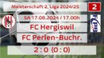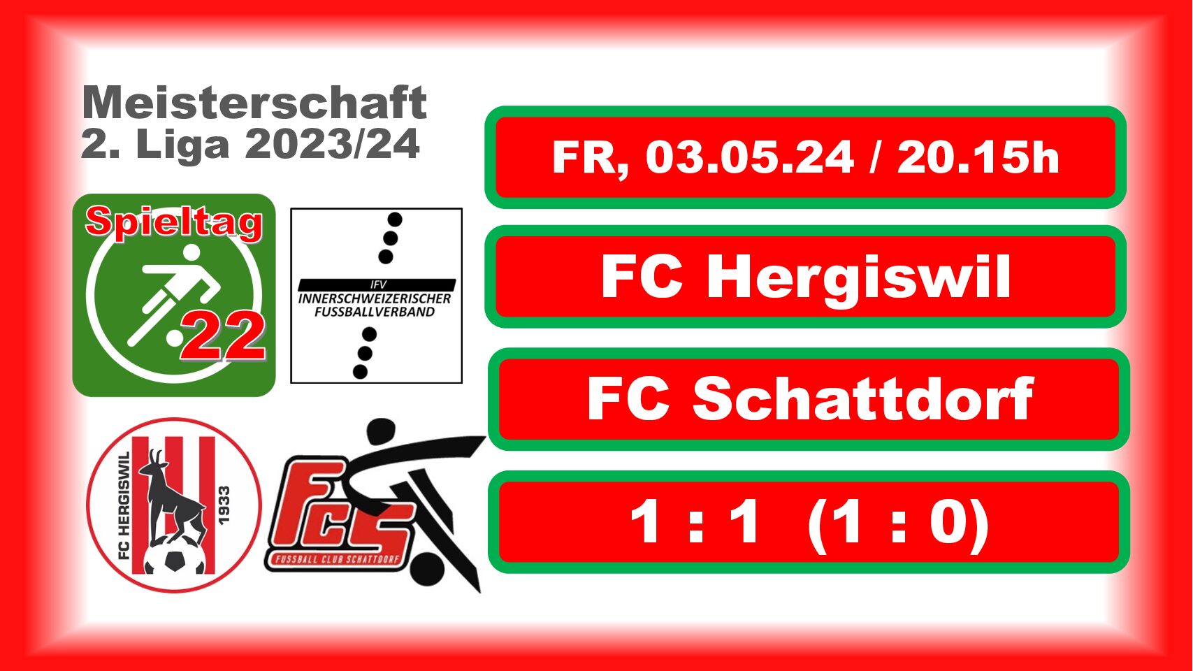 Diese Partie zwischen dem Tabellenzweiten Hergiswil und dem IFV Cup-Finalisten Schattdorf wurde zu einer Begegnung auf Augenhöhe. Beidseitig waren dominante Spielphasen in einer für 2. Ligaverhältnisse auf sehr gutem Niveau stehenden und von 280 Zusehern verfolgten Schlagabtausch. Die Urner kamen hierbei etwas früher in diese Partie mit dem Selbstvertrauen zur Qualifikation zum IFV-Cupfinal am 18.05.2024 gegen den SC Schwyz (3. Liga) vom letzten Dienstag im Rücken zu guten Kombinationen in den eigenen Reihen.