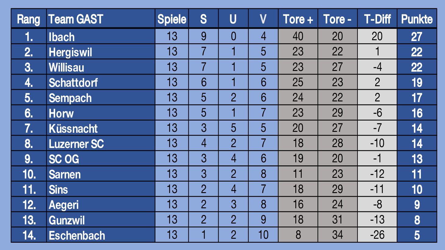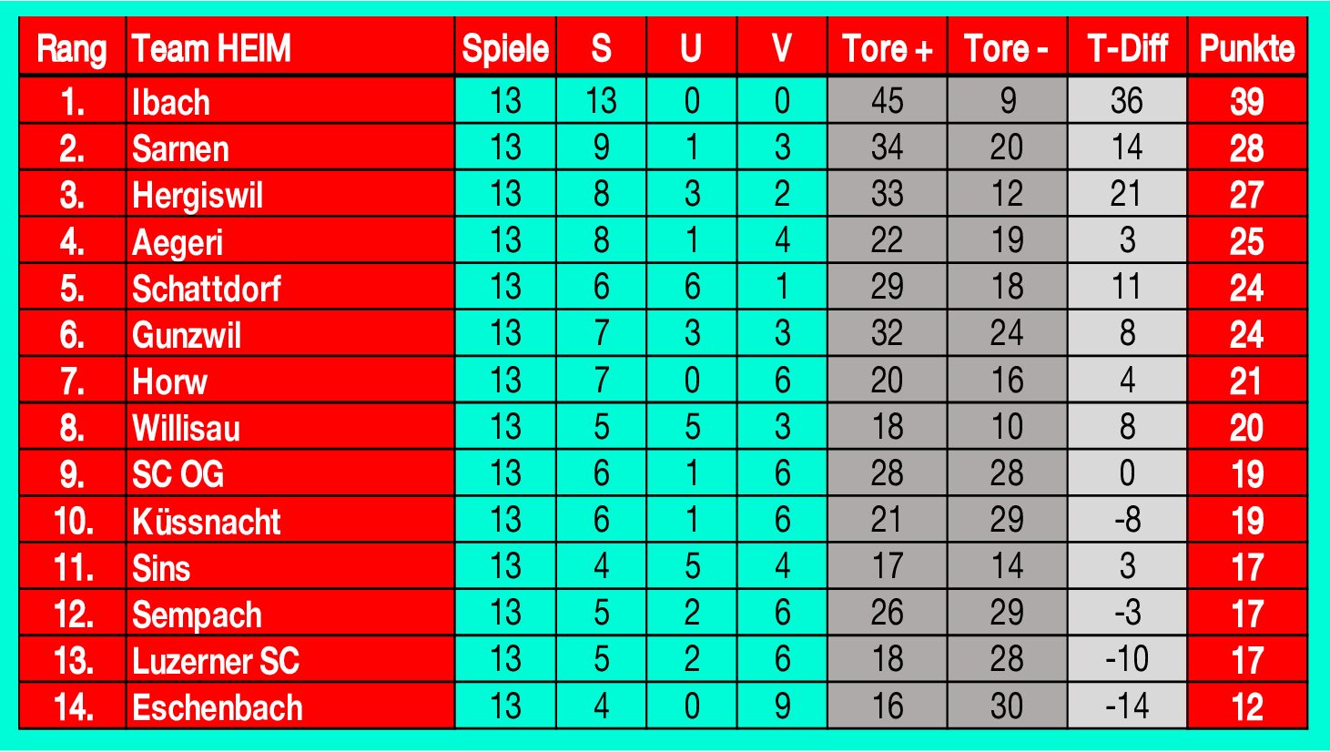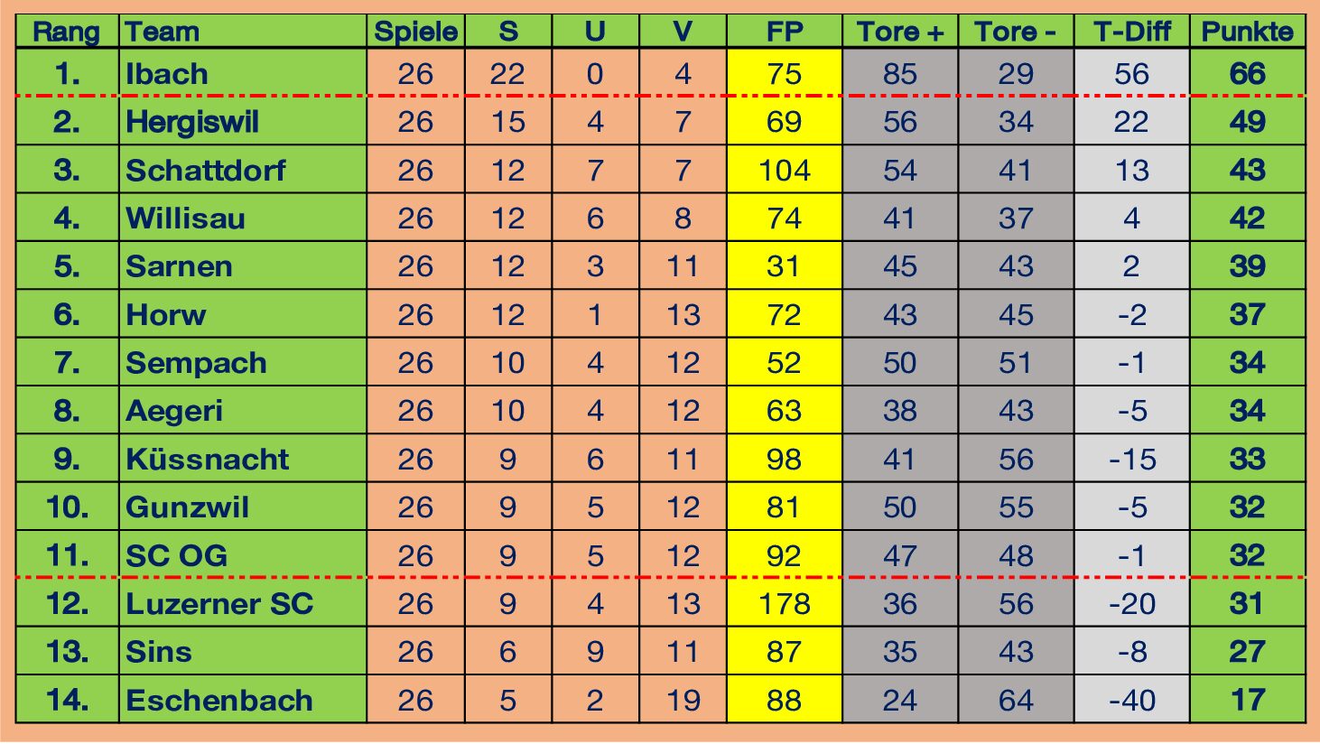Der FCH erzielte in dieser Saison pro Spiel Ø 2,1 Tore und musste Ø 1,3 Tore hinnehmen. Würde man die Torquote alleine aus der Rückrunde mit 33 : 12 Toren berücksichtigen, dann sind die Werte mit Ø 2,5 ; 0,9 doch deutlich verbessert worden und untermauern die starke Rückrunde unserer Marini-Jungs! Eine gewisse Aussagekraft haben auch die sondierten Heim- und Auswärtstabellen, welche wir weiter unten aufgeführt haben. Die 14 Teams spielten von insgesamt 364 Partien in ihren Heimpartien 309 – und in den Auswärtspartien 207 Punkte ein. Der FC Hergiswil beendet diese Saison zu Hause auf Platz 3, in seinen Gastspielen auf Platz 2…
