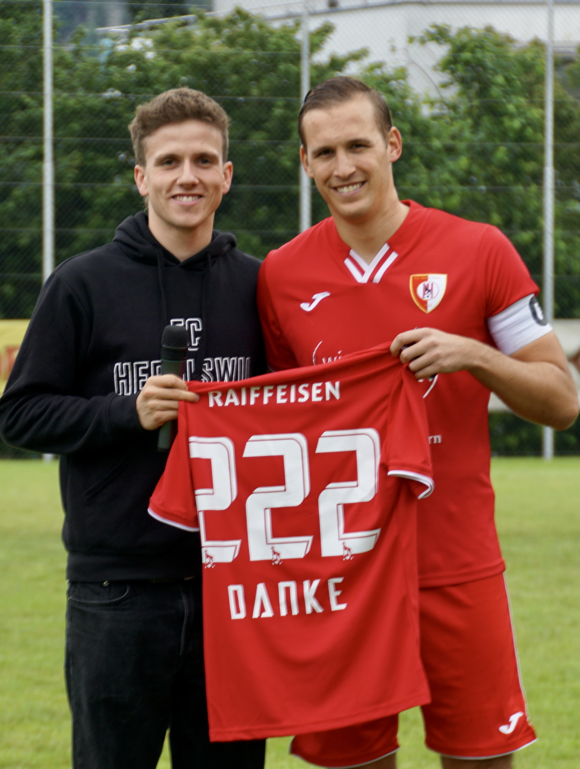 Sandro Marini, Raffael Metzler, Yves Erni, Luca Mombelli jeweils mit FCH-Präsident Jànos Bucher. Jonas Hönger konnte wegen der Kurzfristigkeit seines Abgangs leider nicht offiziell verabschiedet werden.